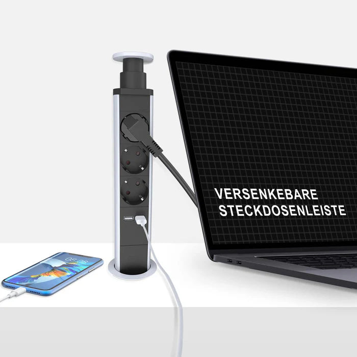 [Multi-functional Power Strip] 3-way retractable power strip arranged at a 45° angle. Can be hidden when not in use, and does not affect the use of the desktop. With two USB ports, smartphones and other devices can be charged directly from the socket without blocking any of the three 230V outlets.